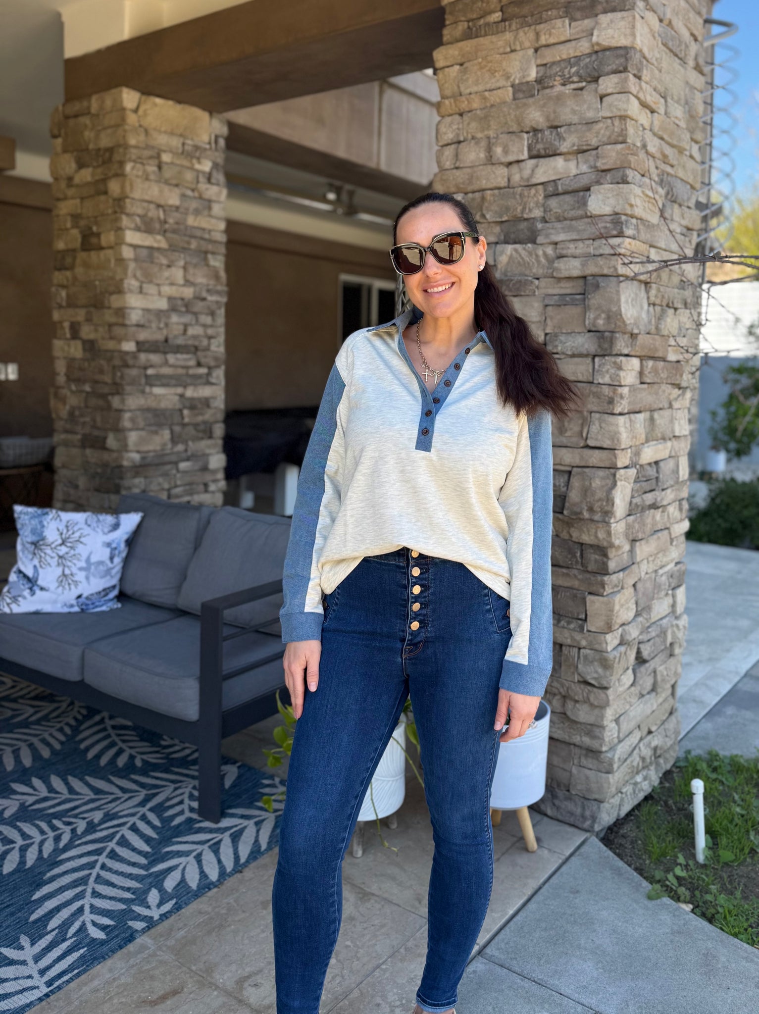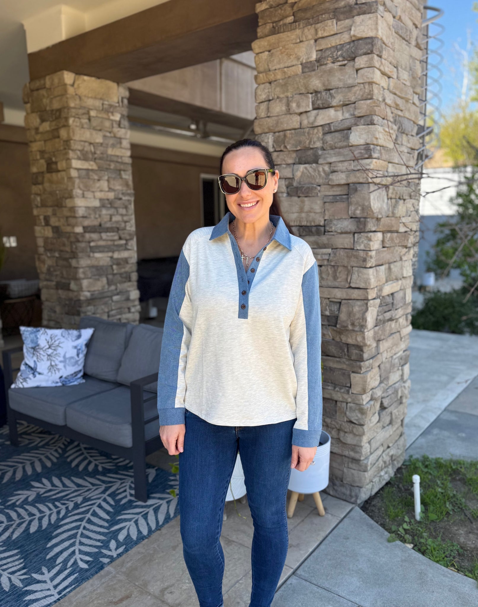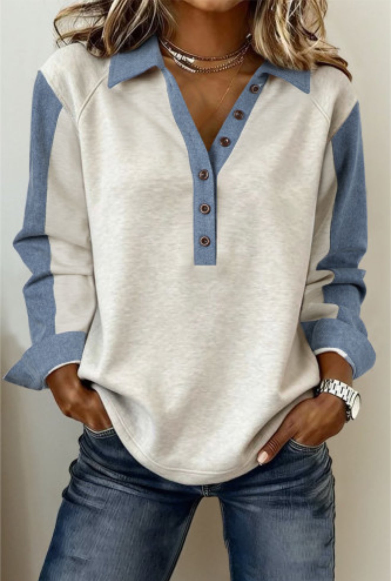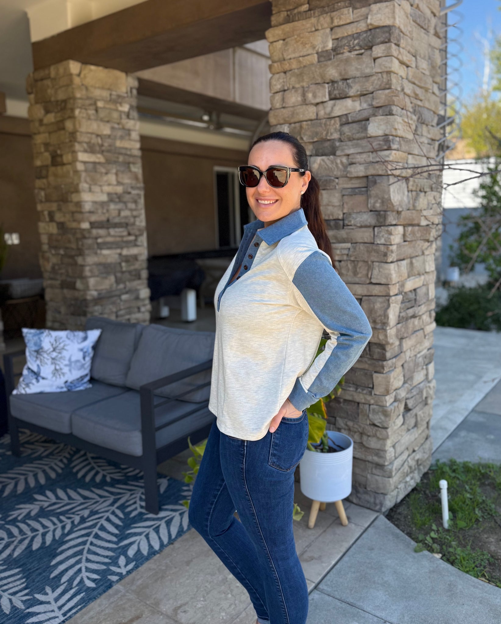 Cream/Denim Buttoned Polo Collar Long Sleeve