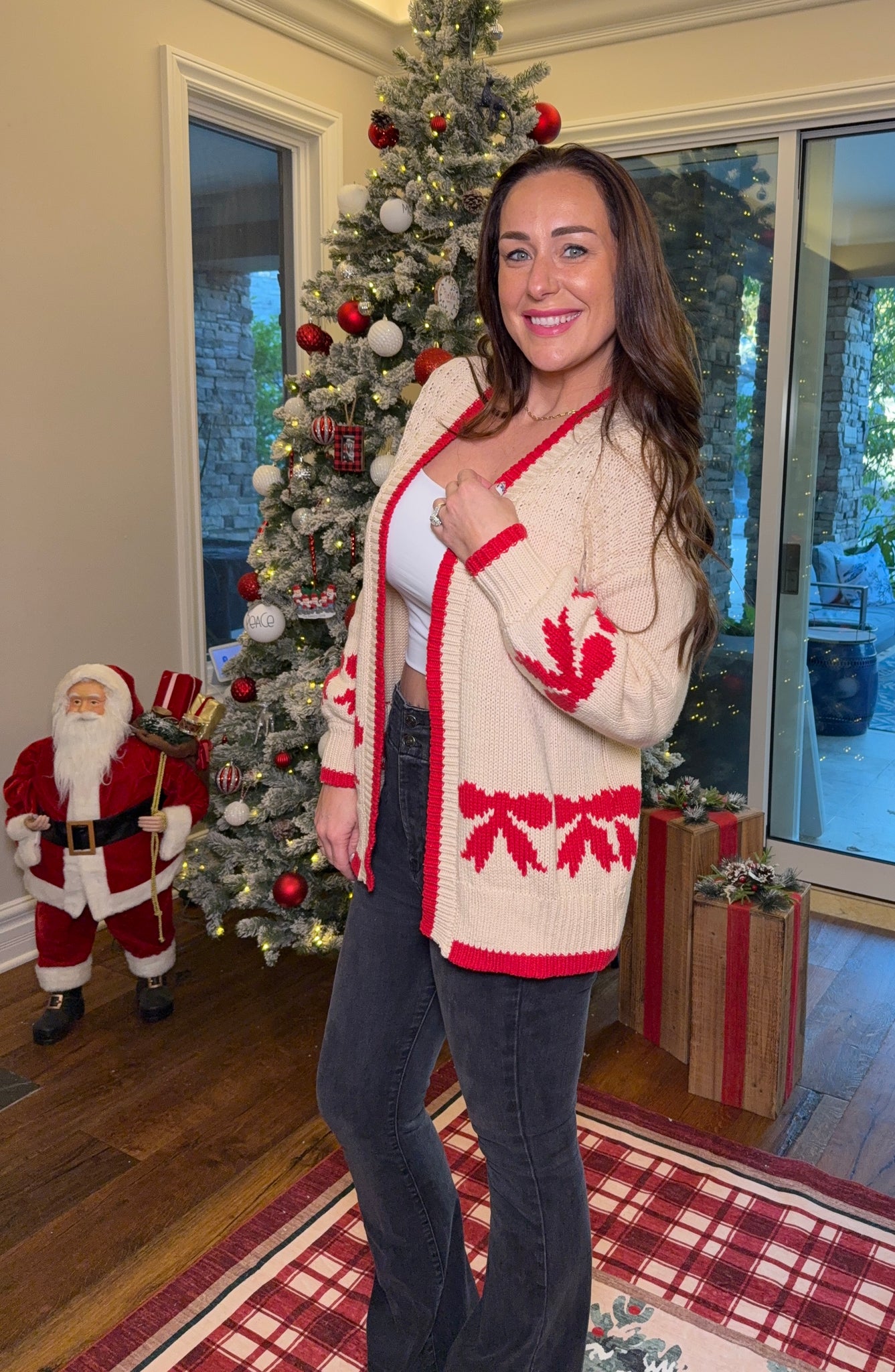 The contrast bow pattern adds a feminine charm to this relaxed cardigan.